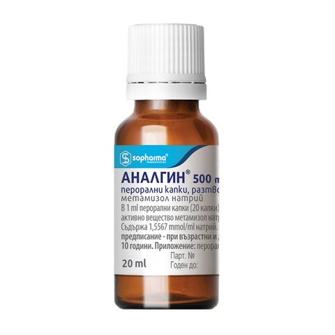 екарствен продукт с обезболяващ и температуропонижаващ ефект, който се прилага за повлияване на умерено до силно изразени болки от различен произход: главоболие, зъбобол, невралгии, неврити, мускулни болки, травми, изгаряния, следоперативни болки, фантомна болка, менструални болки, болки при онкологични заболявания, за понижаване на висока температура и бъбречни и жлъчни колики. Аналгин перорални капки съдържа активно вещество метамизол, което се отнася към обезболяващите лекарства (аналгетици). За разлика от други противовъзпалителни и наркотични обезболяващи – Аналгин® 500 mg/ml перорални капки в препоръчваните дози не нарушава храносмилането и не предизвиква кървене от стомашно-чревния тракт, не потиска центъра на дишане и не води до пристрастяване. Освен това разтворът се усвоява по-бързо от таблетната форма. Предлага се в опаковка от 20 мл.