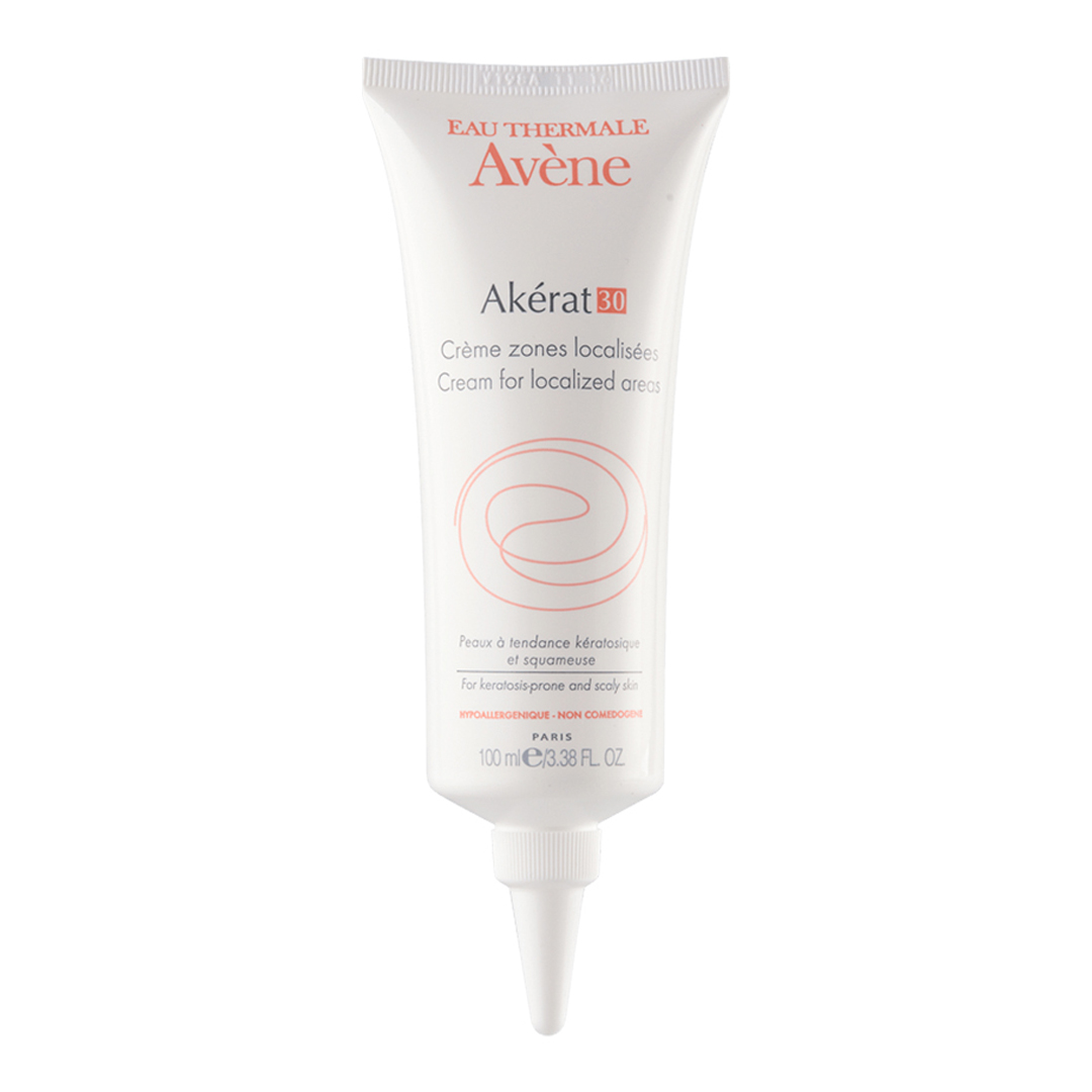 Avene Akerat Cream for Localized Areas представлява крем за локализирани зони, който възвръща еластичността на кожата, отстранявайки дебелите люспести плаки, локализирани в областта на лактите, колената, краката, ръцете и скалпа. Предназначен е за кожа, склонна към вроговяване в локализирани зони (упорито силно удебеляване на кожата по тялото и скалпа). Комбинацията от хидратиращи, висококонцентрирани съставки (урея 30% и млечна киселина) благоприятстват излющването. Вашата кожа е по-гладка и с кадифено усещане. Благодарение на салициловата киселина в по-висока концентрация (2%) се намаляват упоритите удебелявания на кожата. Термална вода Av?ne с успокояващи и антииритативни свойства допринася за цялостния комфорт на Вашата кожа.