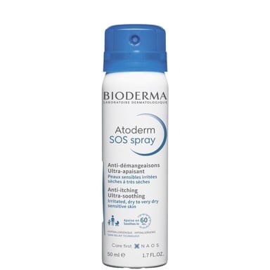 Atoderm SOS спрей на Биодерма облекчава сърбежа и осигурява моментален комфорт. Ултра фините капчици гарантират равномерното нанасяне върху лицето и тялото. Леката текстура осигурява мигновено усещане за свежест. Форматът на продукта (спрей аерозол) позволява безконтактно и удобно нанасяне от 360 градуса във всяка позиция. Формулата е без аромат, без алкохол, с отлична околоочна толерантност. Дарява Ви комфорт без сърбеж в продължение на 6 часа. Предлага се в опаковка от 50 мл