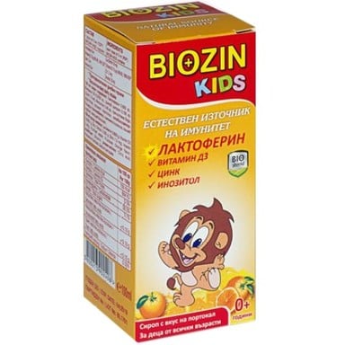 Предназначен за деца от всички възрасти, сиропът Biozin Kids подпомага и поддържа физиологичната функция на имунната система и растежа на децата. Той е създаден със мощно антибактериално, антивирусно, антиоксидантно, пробиотично и противомикробно действие. Повишава имунитета и защитните сили на детския организъм, като го предпазва от болести, благодарение на мощното и синергистично въздействие на комплекса от лактоферин, витамин D3, цинк и инозитол. Без съдържание на глутен, подсладители и алкохол. С приятен вкус на портокал. Предлага се в опаковка от 100 мл