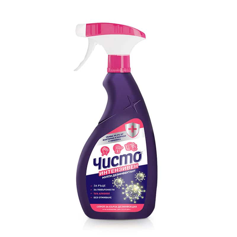 Унищожава 99,9% от всички познати микроорганизми като Staphylococcus aureus, Escherichia Coli, Enterococcus hirae, Candida Albiсans, Pseudomonas aeruginosa. Дезинфекциращо и поддържащо действие. Дезодорира и премахва миризмите. Без отмиване.