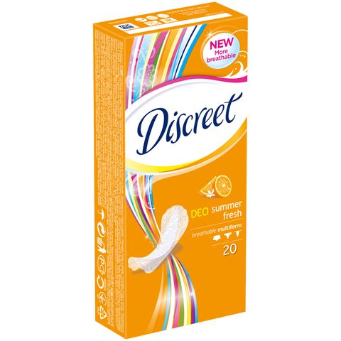 Ежедневните превръзки Discreet позволяват на кожата в интимната зона да диша свободно и осигуряват до 12 часа свежест и комфорт. Те са толкова тънки под 1 мм, че дори не се усещат, а формата им пасва на всеки тип бельо, благодарение на мултиформ качествата им. Със залепване от край до край, за да останат фиксирани рез целия ден. Ароматизирани.