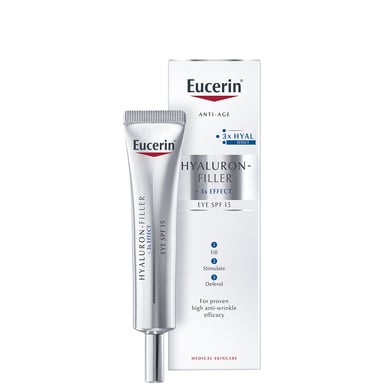 Околоочният крем Хиалурон Филър от Юсерин е създаден да третира бръчките тип “пачи крак”. Разработен е с иновацията 3x ефект – запълва, стимулира и предпазва кожата. За ревитализирането на кожата, кремът се противопоставя на видимите белези на стареене в областта на околоочния контур. С възрастта собственото производство на хиалуронова киселина в кожата намалява, което от своя страна води до състаряване на кожата и оформянето на бръчки в деликатната зона около очите. Hyaluron-Filler е базиран на комбинация от високо и нискомолекулярна хиалуронова киселина, които хидратират и изпълват бръчките. Същевременно кожата е стимулирана да произвежда собствена хиалуронова киселина, благодарение на антиоксидантът сапонин, който спомага и за защита от вредното действие на свободни радикали. В допълнение съставката Еноксолон действа, като намалява скоростта на разграждане на хиалуроновата киселина. С UVA защитата, фактор-SPF15 за предпазване на кожата от преждевременно стареене и задълбочаване на бръчките. Дерматологично тестван. Предлага се в опаковка от 15 мл.