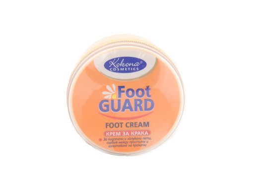 Кремът за крака FOOT GUARD стимулира кръвообращението. Тушира сърбежа и лекува гъбичките между пръстите. Предотвратява напукването на петите и омекотява сухата кожа. Особено подходящ е при изпотяване и неприятен мирис. При намазване специалн агент – микрогранула, се топи и служи като бариера за размножаването на гъбичките. Краката се чувстват комфортно, а кожата става еластична и гладка.