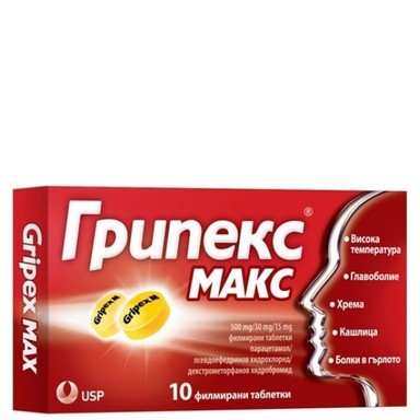 Gripex Max представлява лекарствен продукт, който се отпуска без лекарско предписание, съдържащ парацетамол, псевдоефедринов хидрохлорид и декстрометорфанов хидробромид, предназначен за облекчаване симптоми на простуда, грип и грипоподобни състояния, като втрисане, възпаление на носната лигавица, суха кашлица, главоболие, сухота в гърлото, мускулни и костно-ставни болки. Парацетамолът притежава температуропонижаващ и аналгетичен ефект, декстрометорфана има противокашлично действие, а ефедрина възстановява проходимостта на носа