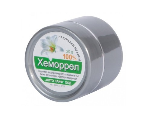 Хеморрел мехлем при хемороиди на Фито Лайф е високоефективен, изцяло натурален продукт на билкова основа за бързо облекчаване, лечение и профилактика на фисури и болезнено възпалени хемороиди, след операция на хемороиди и фисури. Хеморел може да се ползва и при бременност и кърмене, тъй като мехлемът не е токсичен. Предлага се под формата на ръчно направен натурален мехлем с широк спектър на приложение. Основната функция на Хеморрел е да възстановява увредените тъкани, в случаите когато се касае за хемороиди – стените на кръвоносните съдове в долната част на ректума и деформираната хемороидална тъкан, с което облекчава хемороидите и способства прибирането им. Не съдържа изкуствени оцветители, петролни продукти, консерванти, ланолин, аромати, химикали и парабени. Без кортикостероиди и анестетици. Предлага се в опаковка от 20 г