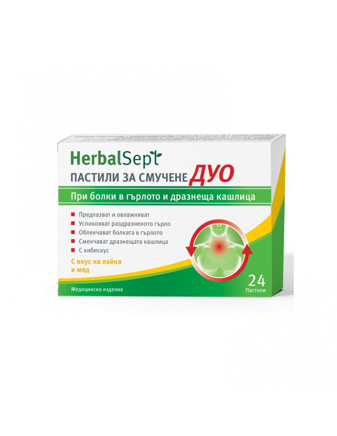 Пастили Хербасепт на Д-р Тайс допринасят за здравето на горните дихателни пътища. Комбинацията от салвия, лайка и мед оказва благоприятен ефект върху лигавицата на гърлото и гласните връзки. Салвията допринася за естествената защита и нормалната функция на имунната система. Съдържа захар.