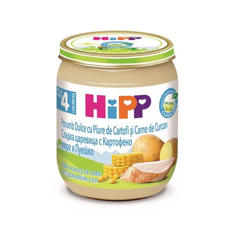 hipp Organic Corn Mashed Potatoes Meat е органично бебешко пюре със сладка царевица, картофено пюре и пуешко месо предназначено за бебета над 4 месеца. Продуктът допълва млечното бебешко хранене и осигуряват необходимите за детето витамини, като по този начин спомагат изграждането на естествените защитни механизми на тялото. Пюрето е без съдържание на изкуствени аромати, консерванти и оцветители и сгъстители. Бебешкият продукт има гладка консистенция. Пюрето е направено от 100% органични продукти. Всички зеленчукови пюрета на “HiPP” са произведени без агенти, стимулиращи растежа, и отговарят на всички законови изисквания относно оцветители и консерванти.