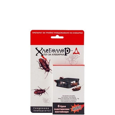 Хлебомор-Д е готов за употреба биоцид за борба с хлебарки в бита, подходящ за употреба в жилищни и складови помещения. Опаковката съдържа 6 пластмасови контейнера с единичен обем 5 гр.