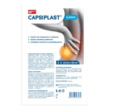 Загряващият пластир Capsiplast от Медика се прилага при схващания и скованост, простудни състояния и други. След полагането му дискомфорта на болезненото място намалява в значителна степен. Поради удобната си форма може да остане залепен върху кожата до 24 часа, след което се отстранява и заменя с нов пластир. Предлага се в опаковка от 1 брой.