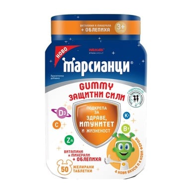 Марсианци Гъми съдържат витамини С и D3, цинк и облепиха за нормалното функциониране на имунната система. Екстрактът от облепиха подкрепя здравето на храносмилателната система. Витамин C и цинк имат антиоксидантно действие, което защитава клетките от оксидативния стрес. Фолиева киселина и витамин С допринасят за намаляване на чувството на отпадналост и умора. Витамин С допринася за нормалното протичане на метаболизма и производството на енергия. С четири страхотни плодови вкуса на маракуя, ягода, малина и портокал. Без изкуствени оцветители. Без консерванти. Без изкуствени подсладители. Без глутен. Без лактоза.