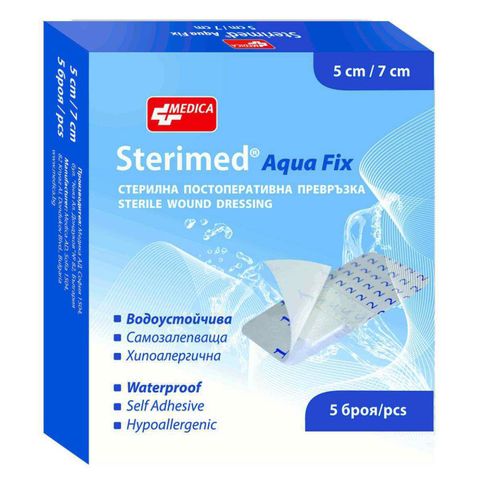 Медика Стеримед Акуа Фикс Водоустойчива постоперативна превръзка 10/30 см 5 бр е стерилна, тънка и прозрачна, така че да е възможно лесно проследяване на процеса на възстановяване на наранения участък. Превръзката се отличава с наличието си на полиуретанов дишащ филм, предпазващ нараненото място от действието на водата и бактериите. Разполага и с мощно абсорбиращ тампон, незалепващ към нараняването. Превръзката на Медика Sterimed Aqua Fix е хипоалергична, прилепва идеално дори и на най-трудно достъпните участъци на тялото, премахва се лесно и безболезнено. Без латекс. Размер: 10х30 см