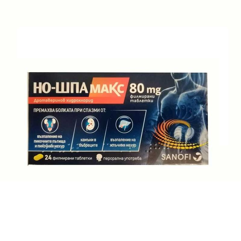 No-Spa Max е специално създаден лекарствен продукт без лекарско предписание под формата на удобни за прием филмирани таблетки без горчив вкус, който действа спазмолитично и се прилага при спазми, болки и присвиване в корема, от причинени от различни причини. Активната съставка в Но Шпа Макс е дротаверинов хидрохлорид, който има диастоличен ефект върху гладката мускулатура. Филмираните таблетки имат благоприятно действие срещу болки в резултат на възпаление на пикочните пътища и пикочния мехур, камъни в бъбреците, възпаление на жлъчния мехур.