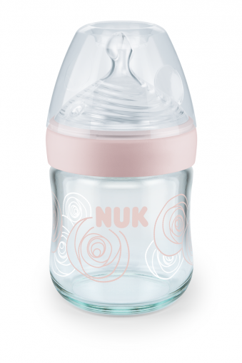 NUK Nature Sense стъклено шише 120мл. с биберон за хранене силикон 0-6 месеца, размер S – подходящ за вода
