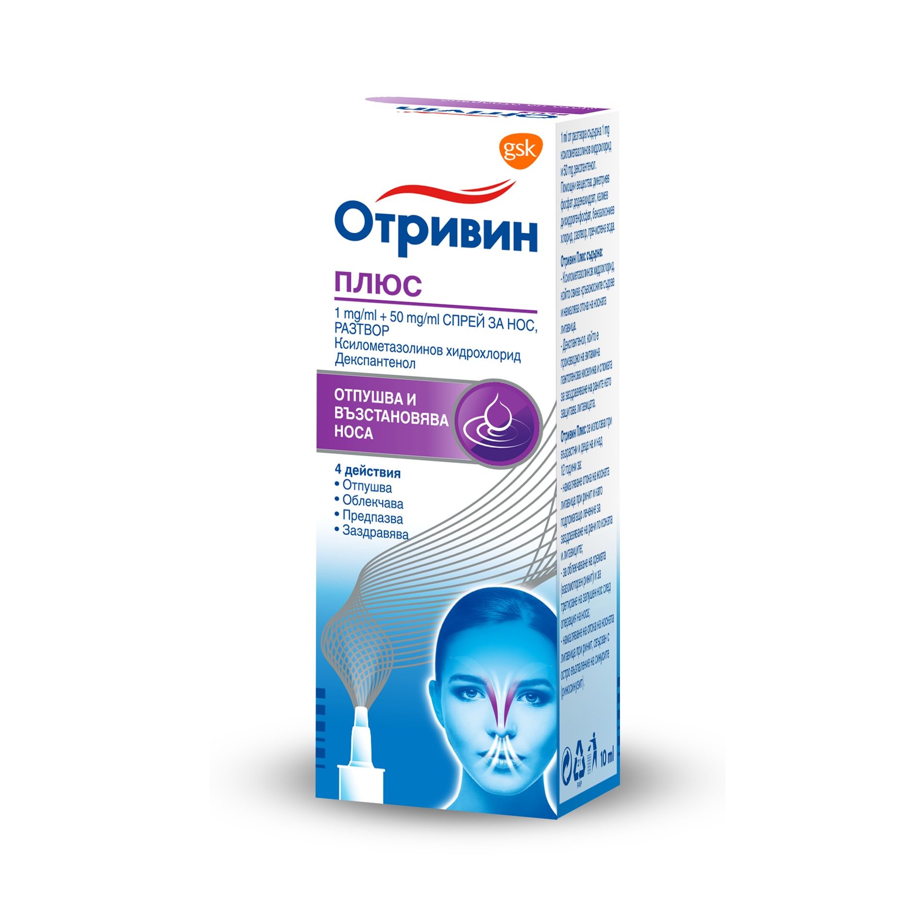 преят за нос Отривин плюс e подходящ за възрастни и юноши над 12 години. Той действа за намаляване на отока на носната лигавица, при ринит и като подпомагащо лечение за заздравяване на рани по кожата и лигавиците. Приложим за облекчаване на хремата (горен ринит) и за третиране на запушен нос след операция на носа. Otrivin се прилага и за намаляване на отока на носната лигавица при ринит, свързан с остро възпаление на синусите (риносинузит). Благодарение на активната си съставка, ксилометазолинов хидрохлорид, разтворът свива кръвоносните съдове, водейки до намаляване на отока на носната лигавица. Съдържа и активната съставка декспантенол, която защитава лигавицата и спомага за заздравяване на раните. Предлага се в опаковка от 10 мл.
