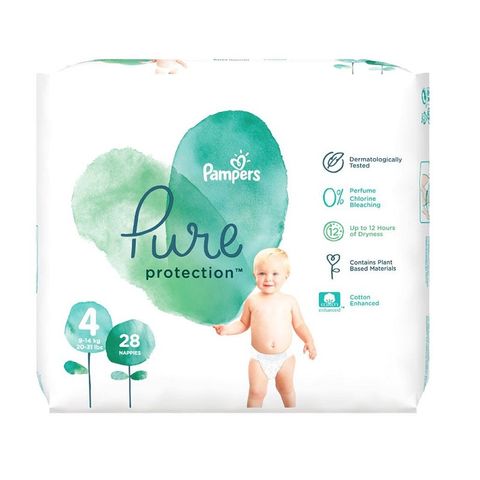 Пелените са изработени от висококачествени растителни влакна и памучен материал, които са изключително деликатни към чувствителната детска кожа и я оставят суха и нежна. Pampers Pure Ptotection не съдържат парфюм, латекс и не са избелени с хлор, те предлагат безкомпромисно качество и всеки един размер е създаден с богато разнообразие от очарователни илюстрации. Пелените Pure Protection от Памперс са проектирани с индикатор за влага, те са дерматологично тествани, а еластичните страни допринасят за повече комфорт, без компресия върху тялото на бебето.