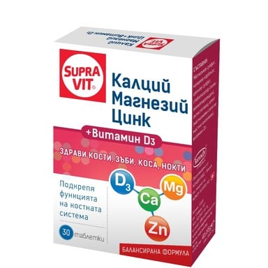 Supravit Calcium Magnesium Zink + Vitamin D3 представлява хранителна добавка съдържаща калций, магнезий, цинк и витамин D3, които подкрепят функцията на костната система и допринася за здравето и красотата на зъбите, косата и нокти. Калцият е необходим за поддържане състоянието на костите и зъбите. Магнезият спомага за нормалния синтез на белтъчини и за намаляване чувството на отпадналост и умора. Цинкът допринася за метаболизма на макрохранителните вещества. Витамин D3 съдейства за нормалното усвояване на калция и фосфора. Продукта притежава балансирана формула съдържаща чисти витамини и минерали от най-високо качество. Създаден по иновативна швейцарска технология, която не съдържа ГМО, глутен и подсладители. Продукта се препоръчва за здрави кости, зъби и нокти, също така и за красива коса и кожа.