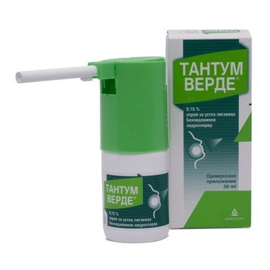 Спреят за гърло Tantum Verde е предназначен за впръскване в устната кухина и гърлото, в случай на възпалителни процеси, освен това е подходящ за приложение и в стоматологичната практика – преди и след вадене на зъб. Спреят съдържа активното вещество бензидаминов хидрохлорид. Бензидаминов хидрохлорид притежава изразени противовъзпалителни и болкоуспокояващи свойства. Въз основа на бързото проникване и на локалното натрупване във възпалената тъкан, се стига до бързо отслабване на болките и оплакванията при преглъщане. Поради съдържание на ментол, продуктът не се препоръчва за приложение при деца под 5- годишна възраст. Спреят няма противопоказания за оромукозно приложение на бензидаминов хидрохлорид от бременни и кърмачки.