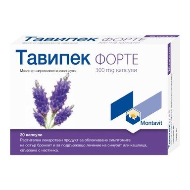 Tavipec Forte на Montavit е растителен лекарствен продукт без лекарско предписание за облекчаване симптомите на остър бронхит. Тавипек Форте е приложим и при поддържащо лечение на синузит или кашлица, свързана с настинка. Тавипек форте е предназначен за възрастни и деца над 12 години. Ако след 7 дни поддържате висока температура или не се чувствате по-добре, трябва да потърсите лекарска помощ.