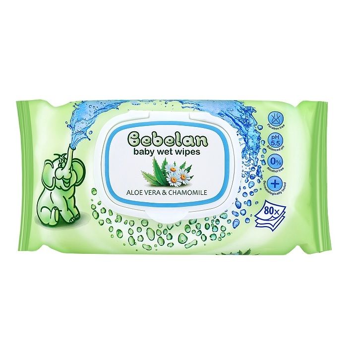 Бебелан влажни кърпи от нетъкан текстил, напоени с екстракт от алое и лайка. Почистват и освежават, като предпазват от възпаления деликатната кожа на бебето. Практични за употреба, с пластмасов капак за оптимално съхранение, подходящи при смяна на пелени и отстраняване на замърсявания. С 5.5 pH, без аклкохол. Предлагат се в опаковка от 80 броя.